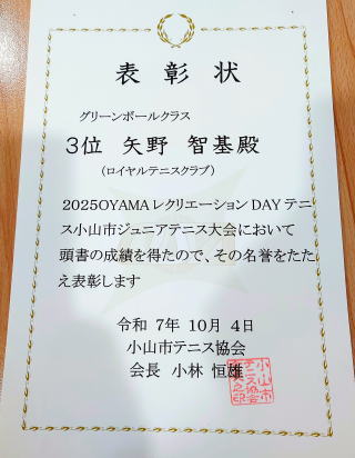 | 2025年小山テニス協会の大会で3位入賞しました。 |